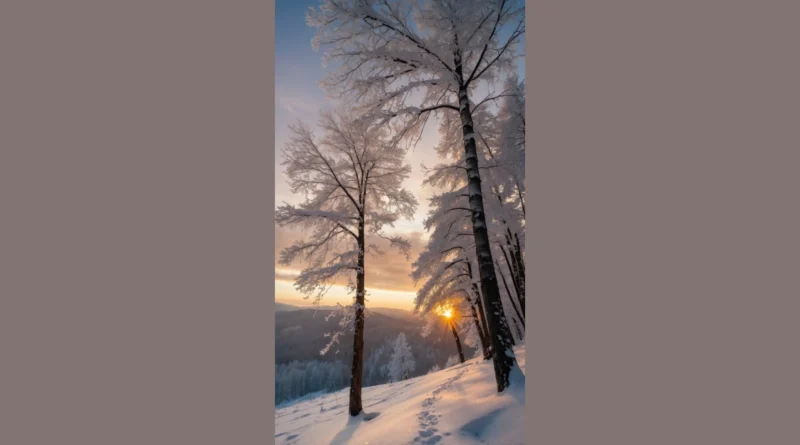 Check out this picture, it’s like winter decided to put on its fanciest outfit! Those trees aren’t just covered in snow; they’re absolutely sparkling with frost, looking like they’ve been dipped in glitter, especially with that gorgeous golden hour light hitting them. And that sun peeking through? It’s like a shy spotlight trying to highlight all the magic happening on this snowy hillside. You can almost hear the satisfying crunch of snow underfoot as someone explored, and honestly, standing there would probably make you feel like you’ve walked right into a giant, real-life snow globe, but way better because of that warm, golden glow trying its best to thaw things out.