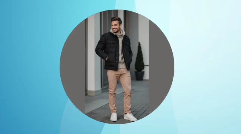 But wait, there’s more to this winter wizardry than just the top half! His crisp brown chinos, perfectly cuffed to show off those super clean white high-top sneakers, prove that even your feet can join the fashion party when it’s cold. Those shoes are so bright, they could probably reflect sunshine even on the cloudiest winter day. And with those cool shades, he’s basically telling the sun, “I don’t need you to shine, I’ve got my own glow!” This outfit isn’t just about surviving winter; it’s about owning it with style and a confident smile, making him the king of casual cool among winter outfits for men.