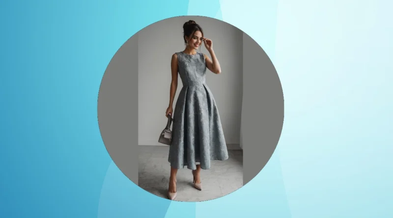 Look at this awesome frock, proving that not all dresses are created equal! This isn’t just a dress; it’s a “I’m ready to own the room” kind of vibe, perfect for any woman who wants to feel a bit fancy without trying too hard. The soft blue-grey color with those intricate patterns is so classy, it practically whispers, “I have my life together,” even if you secretly just spent an hour trying to figure out TikTok trends. And that pleated skirt? It’s practically begging for a twirl, or at least a graceful strut that says, “Yes, I’m wearing a fancy frock, and no, I don’t care if I spill my soda.”
