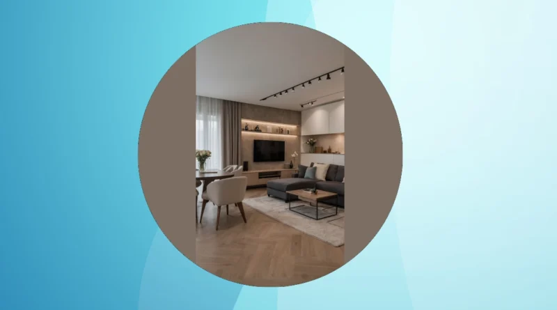 This isn’t just a room; it’s a modern masterpiece that’s clearly aced its interior design exams. Notice the super cool track lighting on the ceiling, ready to illuminate your every awesome hangout, and those sleek shelves behind the TV with their built-in glow? They’re like a fancy display case for all the cool stuff you don’t even own yet! With those chic herringbone wood floors and the perfectly placed rug, this space is so put-together, it practically whispers, “Welcome to adulthood, but make it comfy and stylish.”