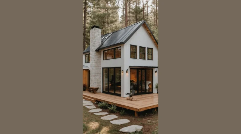 Wow, check out this place! It’s supposed to be a ‘tiny home,’ but honestly, it looks like it could comfortably fit your entire Fortnite setup, a stack of snacks, and still have room for a spontaneous dance-off. Nestled right there among those tall, whispery trees, this house looks incredibly sharp with its crisp white siding and cool black roof. It’s got a super chic vibe, almost like it’s posing for a magazine cover, and that big stone chimney just adds to its impressive, cozy-but-modern look.